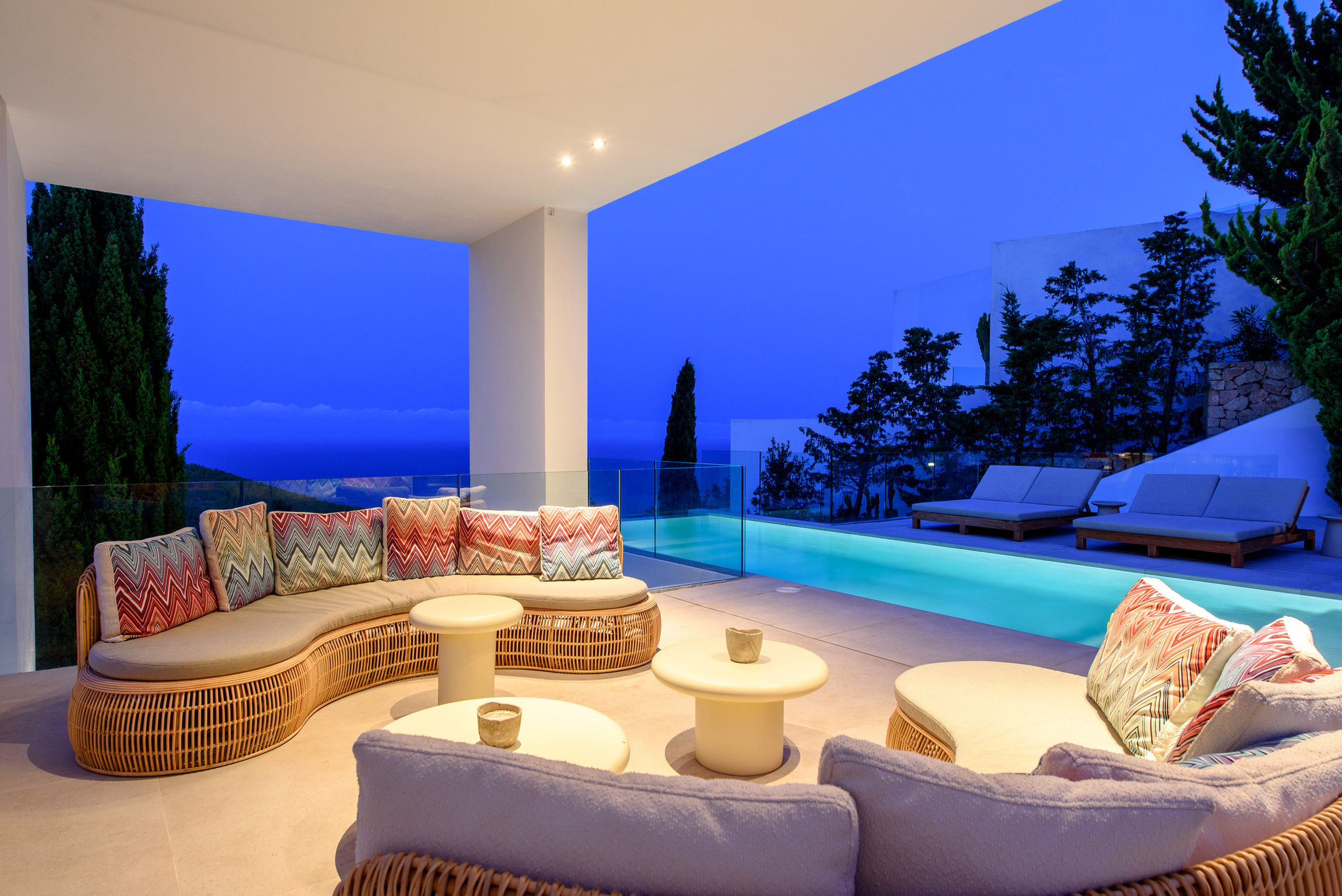 From the pool lounge enjoy the incredible views on the balearic seas and green hills. Let yourself be hypnotized by the changing colors of these views… Infinity heated pool, sunbeds, pool shower, BBQ, property electric gate and private parking.